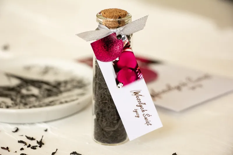 Buteleczki z herbatą jako firmowy upominek. Przywieszka z logo firmy oraz dowolną treścią i grafiką - Model H6